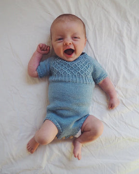 Millas Sommardräkt är inspirerad av 1950’talets stickning till barn, där framstycket på dräkter och klänningar ofta var smockstickade. Dräkten är också fin med strumpbyxor och en stickad cardigan. Millas Sommardräkt stickas nerifrån och upp, och passformen är tajt.