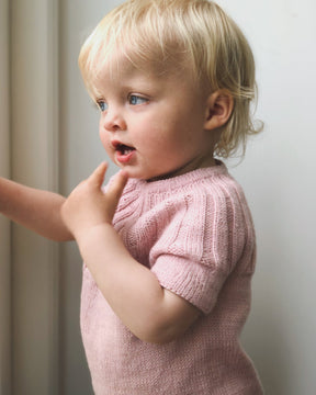 Sunday Tee Mini stickas uppifrån och ner. Oket stickas runt i resårmönster med ökningar. Bålen och ärmarna stickas runt i  slätstickning och avslutas båda med en vikt kant.