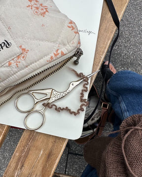 Gyllene broderisax med storkmotiv. Storksaxen är i rostfrit stål och har en perfekt storlek för att ha i projektväskan.