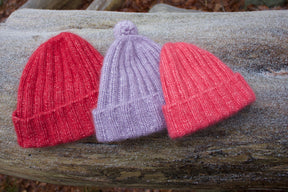 På bilden har jag på mig mössan i färgen hallon på den första bilden, på den andra bilden är mössan stickad i ljuslila och den tredje mössan är stickad i pink.