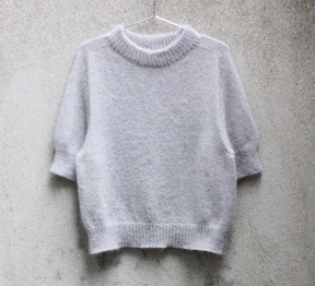 The Carlie Tee is a classic basic shirt with short sleeves and a wide double-fold neckline in elastic. The sweater has an elegant shoulder construction, where the shoulder continues into a sleeve. It is finished with elastic edges on the sleeves and torso. The sweater is knitted in the round from top to bottom with shoulder and sleeve increases.