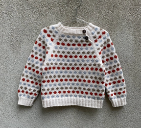 Prik Blouse is knitted in a dot pattern, which gives you the opportunity to put your very own stamp on the look of the shirt with a multitude of possible color combinations. At the same time, the sweater is an excellent opportunity to get rid of some of your leftover yarn. The sweater is knitted from top to bottom with raglan increases, while a simple dot pattern is knitted in multicolored knitting, Fair Isle technique. The sweater has an elastic at the neck with a slit, as well as elastic cuffs that finish the sleeves and torso.