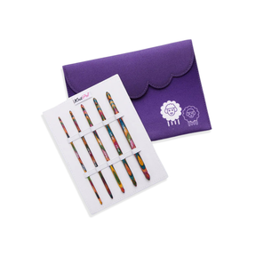 Setet innehåller fem dubbelsidiga virknålar i de mest använda storlekskombinationerna och levereras i ett lila tygfodral som håller ordning och gör setet enkelt att ta med.