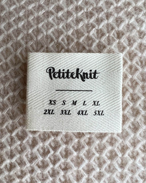 Woven label with text "Made By Someone Who Loves Me. With Help From PetiteKnit". For your knitted gifts.