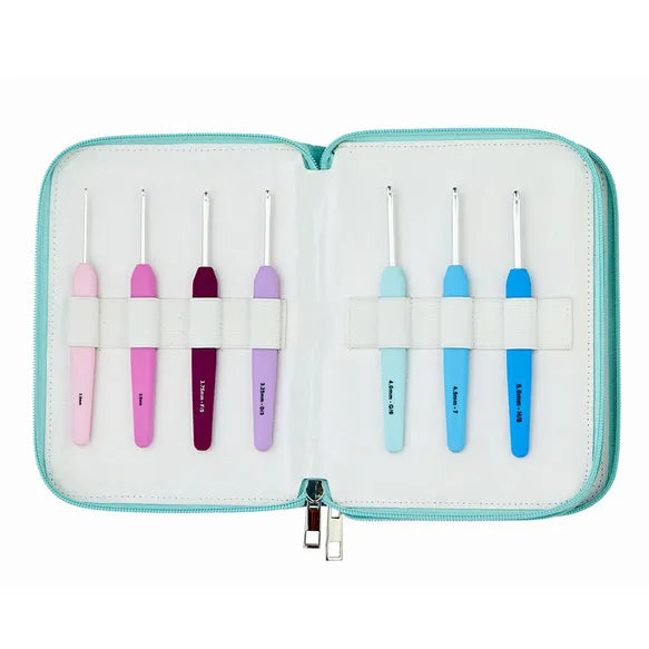 Virknålarna är tillverkade i lätt och slitstark aluminium, med mjuka och bekväma gummihandtag som gör att du kan virka länge utan att bli trött i handen. Den ergonomiska formen ger ett skönt grepp och gör arbetet både smidigt och avlastande.