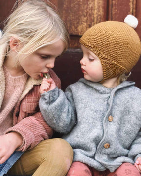 The golden Alberts Pilot Hat is knitted in Sunday from Sandnes Garn in the color Croissant.