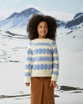 Fjære sweaters with the pattern in two colors in Fivel . It has a relaxed fit with a raglan, round neck and ribbed edges. The sweater is knitted from the top down. The neckline is formed by knitting double crochets, and it is increased to the raglan on each side of 3 raglan sts. To get an oversized fit, choose a size that has a chest width that is 8-15 cm larger than the child's chest width.