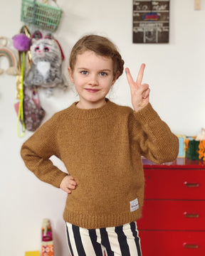 The Inga Krusiduller Sweater Junior is a simple raglan sweater with a deeper neckline at the front. The fit is slightly oversized, but the wide elastic edges and the slightly shorter length give the sweater a feminine cut. Inga Krusiduller Sweater Junior is knitted from the top down, so it is recommended that the sweater is tried on in the meantime, so that you can adjust to the length of the sleeves and body that suit you. If you want to preserve the tight neckline, you can sew in a thin elastic thread along the elastic edge.