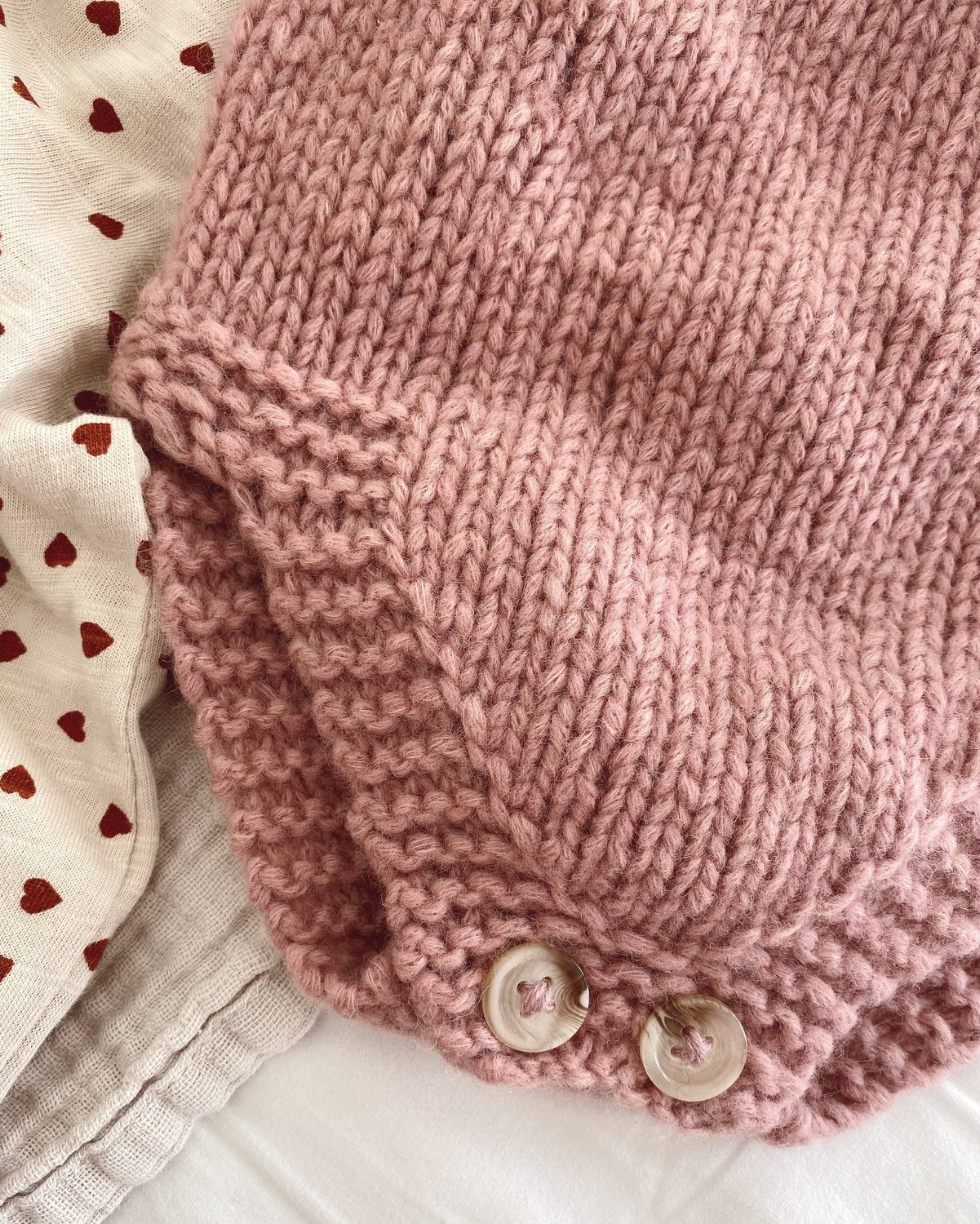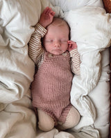 Romperen stickas nedifrån och upp. Nederdelens framstycke stickas först, därefter bakstycket. Kroppen stickas runt på rundsticka, medan överdelens fram- och bakstycke stickas var för sig.