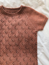 Rigmors Sommarblus junior stickas på rundsticka nerifrån och upp med raglanminskningar. Ärmarna stickas runt på strumpstickor. Halsringningen formas med hjälp av förkortade varv. För att uppnå en varaktig passform vid halsen, kan en tunn resårtråd sys längs halskanten. Tröjan har ett feminint och enkelt hålmönster.