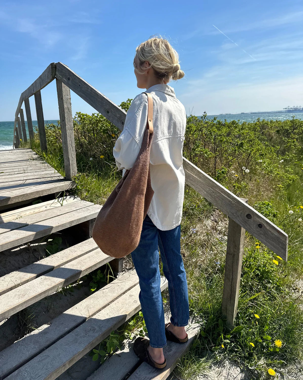 Den bruna Terrazzo Bag är stickad i Hør Organic från Isager i färgen Camel.